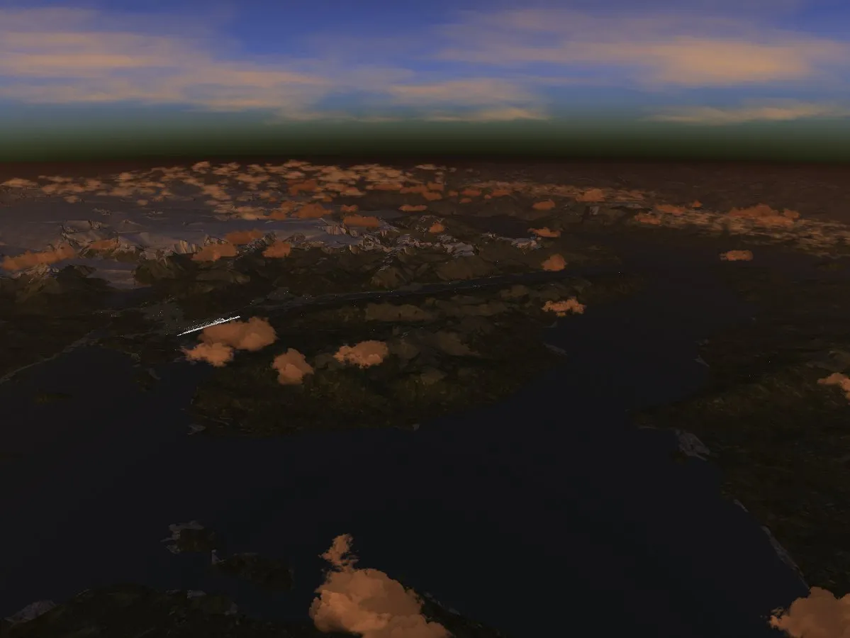 Convection may also occur due to vertical instabilities in upper air layers, leading to the development of Altocumulus clouds, or at even higher altitudes Cirrocumulus clouds. Here’s an example of the development of Altocumulus fields at 15.000 ft. At such high altitudes, the clouds are no longer influenced by the terrain underneath, but rather by the properties of the air layers between which the Altocumuli form. For instance, Altocumulus development may be caused by the instabilities associated with an approaching cold front, and may thus signal the danger of severe thunderstorms in the near future. The Advanced Weather offline weather generation automatically includes this and other rules of large-scale weather patterns.