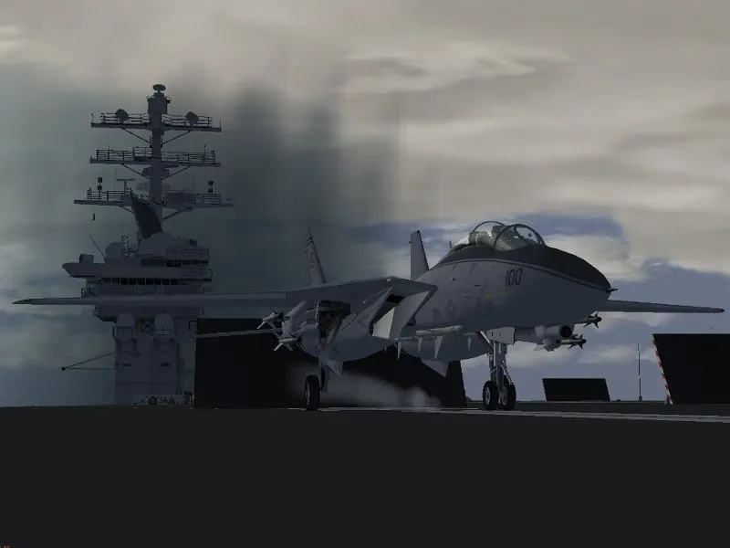 The flight deck of the USS Carl Vinson, 8:30 am Pacific Daylight Time, off the US west coast: an F-14b is made ready for a flight. The weather is rough, 16 kt of winds coming from the open ocean, with gusts reaching up to 20 kt and changing directions. The Vinson has just crossed a patch of rain, but the clouds seem to be breaking up.