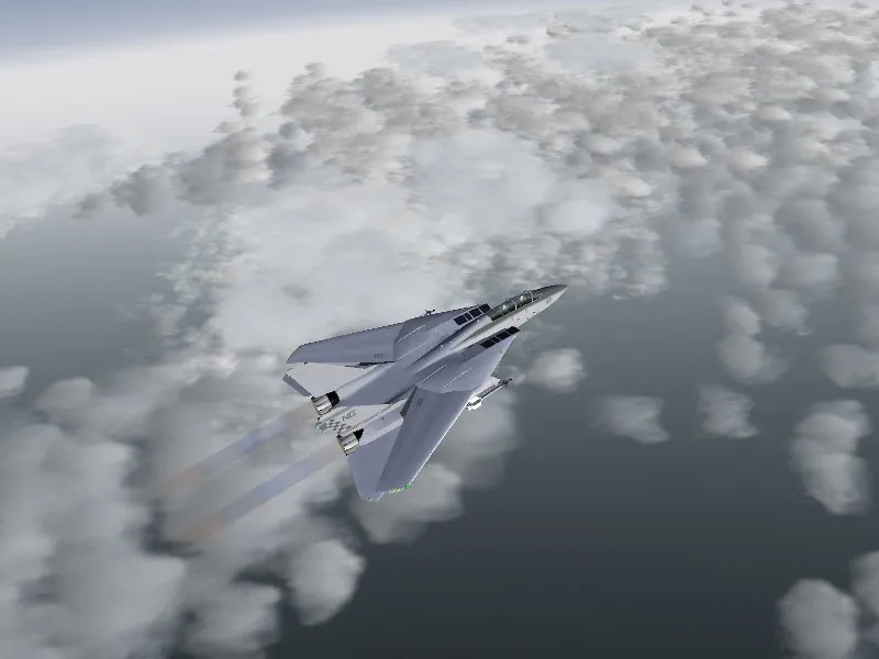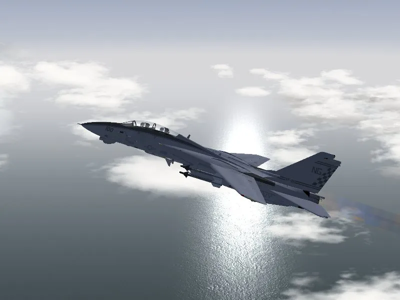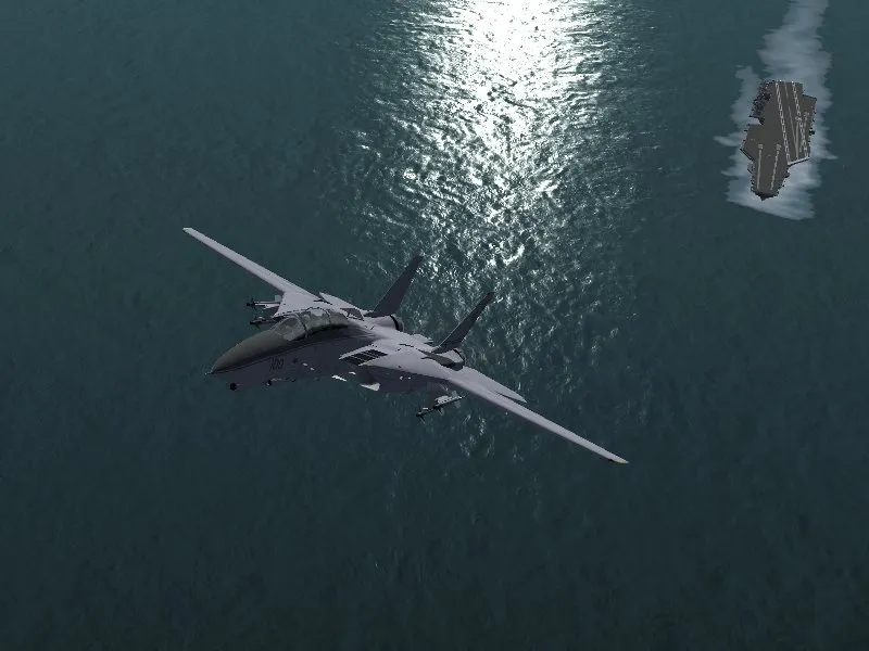 The scenario is set up using FlightGear’s AI system – both the carrier group and the intercept target are defined as AI scenarios which are defined before starting the simulation. Here I am using a simple setup placing a target on a predefined course – but using FlightGear’s scripting language, it would easily be possible to set up a situation completely unknown to me, or an unknown number of targets, or even a scenario which reacts to my presence in a certain way. AI scenarios can be quite complex – the Vinson scenario simulates the movement of a whole carrier group! The weather conditions can come from live weather reports, or be generated by a sophisticated offline weather system. Many planes in FlightGear (such as the F-14b) offer multi-crew support, i.e. in principle I could share this mission with a human as RIO – in this case however, I’m actually flying alone.