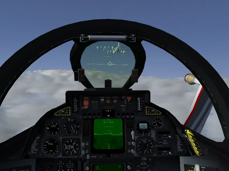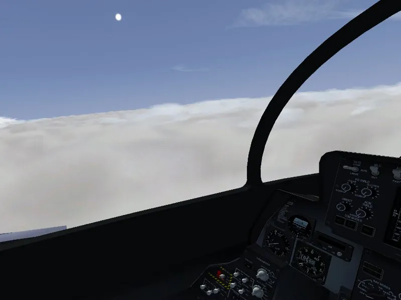 TACAN guides us back to the Vinson. This time, I fly in the subsonic regime. Another 15 minutes later, we start to descend at the position of the Vinson. Here’s the view from the RIO position as we descend towards a cloud later at around 8000 ft.