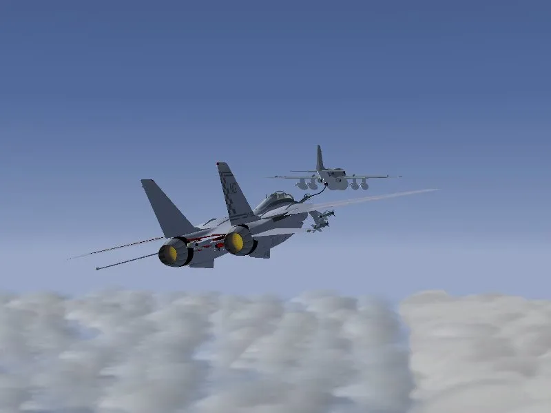 Aerial refueling, both via probe (as demonstrated here) and boom is implemented in FlightGear. Although many aspects are easier than in real life (there is no turbulence induced by the tanker for instance), it is a tricky enough maneuver to master – especially since the AI tankers fly realistic racetrack patterns, i.e. at some point they start to turn!