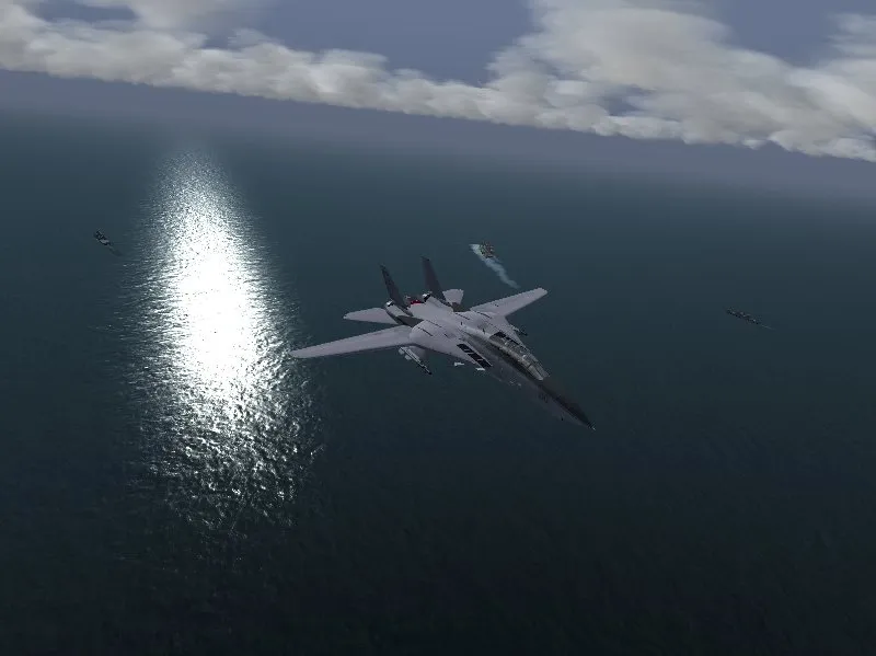 The scenario is set up using FlightGear’s AI system – both the carrier group and the intercept target are defined as AI scenarios which are defined before starting the simulation. Here I am using a simple setup placing a target on a predefined course – but using FlightGear’s scripting language, it would easily be possible to set up a situation completely unknown to me, or an unknown number of targets, or even a scenario which reacts to my presence in a certain way. AI scenarios can be quite complex – the Vinson scenario simulates the movement of a whole carrier group! The weather conditions can come from live weather reports, or be generated by a sophisticated offline weather system. Many planes in FlightGear (such as the F-14b) offer multi-crew support, i.e. in principle I could share this mission with a human as RIO – in this case however, I’m actually flying alone.