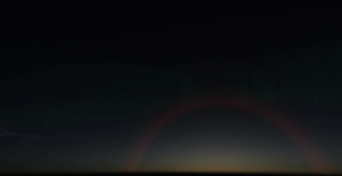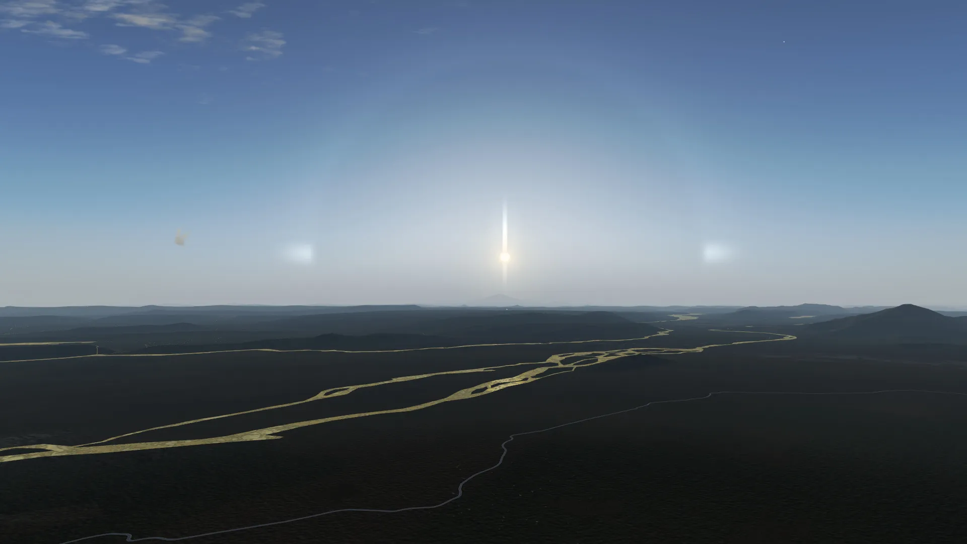 Aurora Borealis, and sun halo. The halo is caused by light bouncing off ice crystals in the atmosphere. The halo is red as the sunlight from the low sun is red. Try setting ‘time warp’ to 4x or more in Environment > Time to see the Aurora dance a bit more clearly.