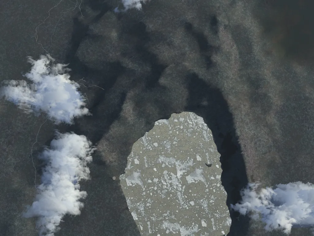 A caldera in the central highlands with a large lake, in the colder part of the year. There is a thin layer of snow, and the water has some ice cover – environment simulation options like these are set from Environment menu > Environment Settings: