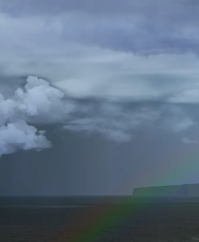 While the mythical pot of gold at the end of a rainbow is hard to find, you have found a country with a lot of rainbows. Iceland’s wet, changing, weather and a sun that is often low means a lot of chances to go rainbow hunting. Rainbows aren’t just a texture in FlightGear, they are simulated. Like halos, rainbows are the ALS light simulation interacting with the weather simulation – rainbows are light bouncing towards you from rain droplets. Rain falls under specific clouds, and you may only see part(s) of a rainbow. Unlike halos, a rainbow isn’t around the sun. A rainbow is a large circle around the point opposite the sun from you, the anti-solar point. To locate this point draw an imaginary line from the sun to you. To see a rainbow, you should be between the rain volume and the sun. The intensity of rainbow depends on things like how heavy the rain is and the size of raindrops. Very light rain (drizzle) makes subtle rainbows. To see a rainbow, there needs to be at least one gap in cloud cover for the sun to shine through. Flying when the sun is low increases your chance of spotting rainbows.